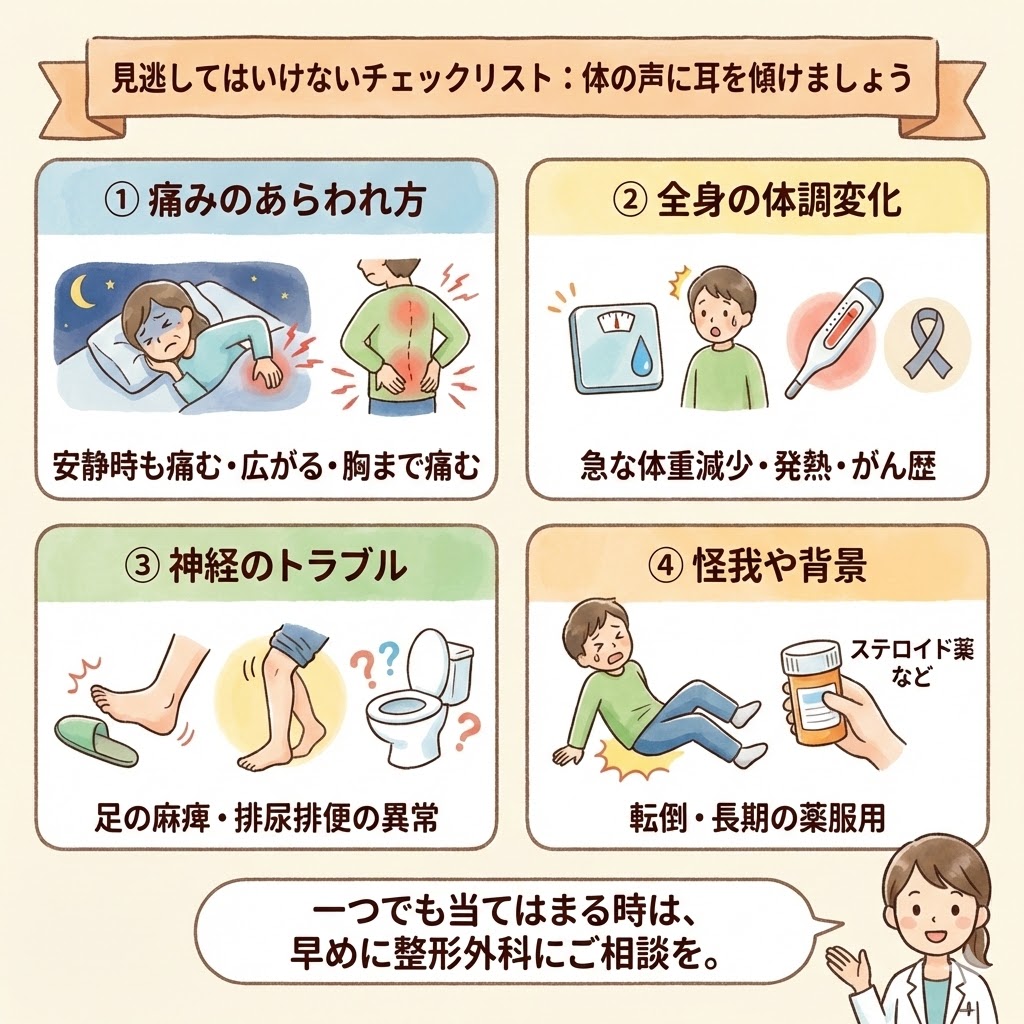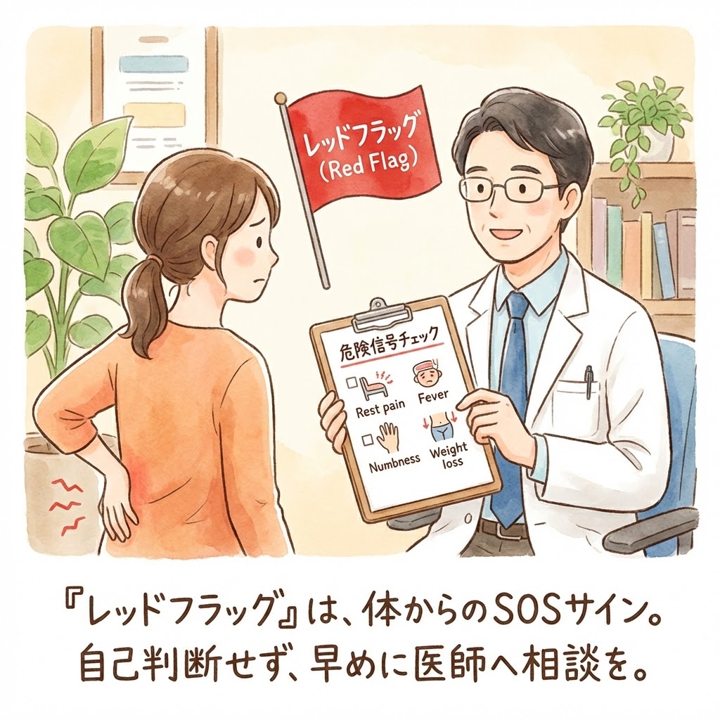 専門用語でレッドフラッグと呼ばれる危険信号についてお話しします。ご自身や大切な家族の健康を守るために、ぜひ一緒にチェックしてみてくださいね。