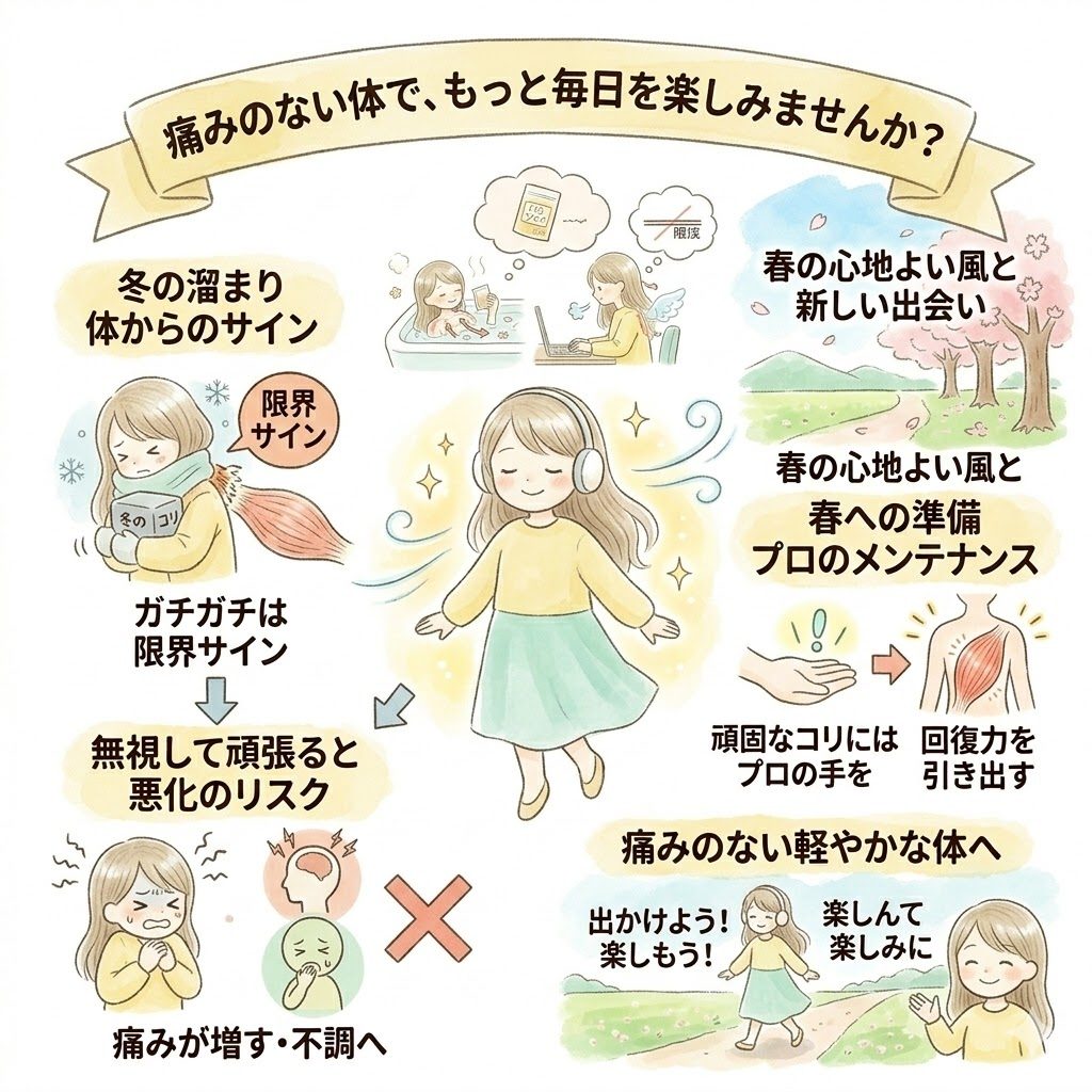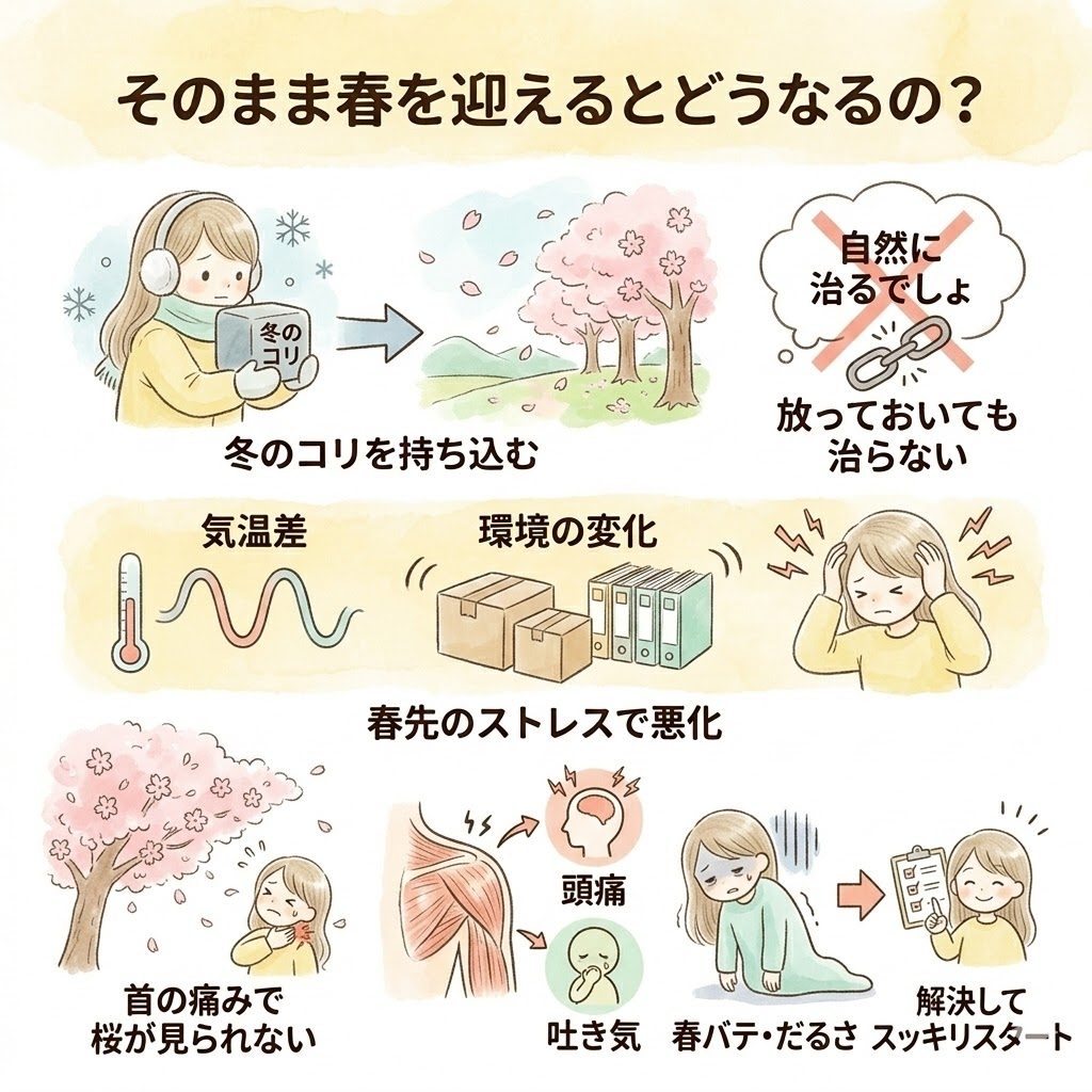 冬の間に溜め込んだ首や肩のガチガチは、体からの「もう限界だよ」というサインかもしれません。