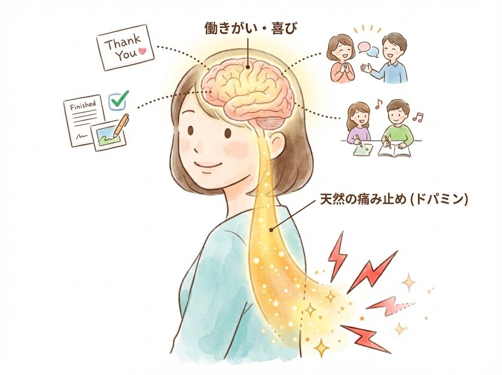 このドーパミンが、痛みの信号を抑えるブレーキのような役割を果たしてくれるのです。