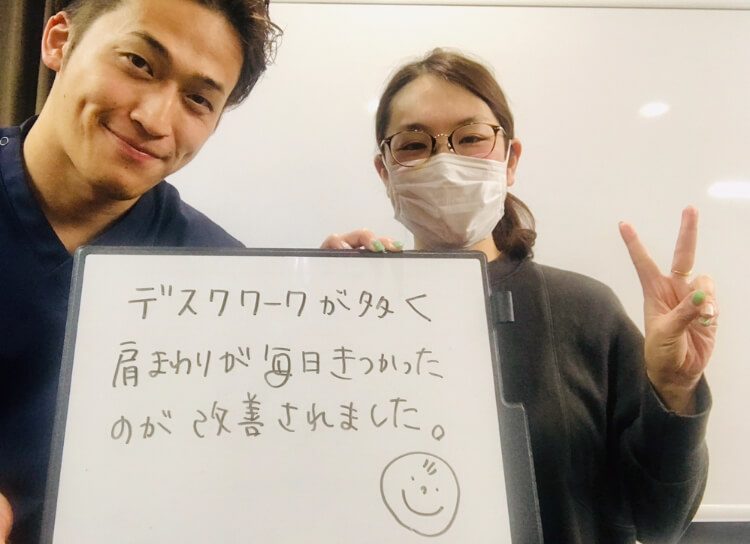 デスクワークの多い仕事柄、肩こりに毎日悩まされていました。夜も寝付けないほど苦しかったのですが、ここに来てからはそんな悩みも全く気にならなくなりました!